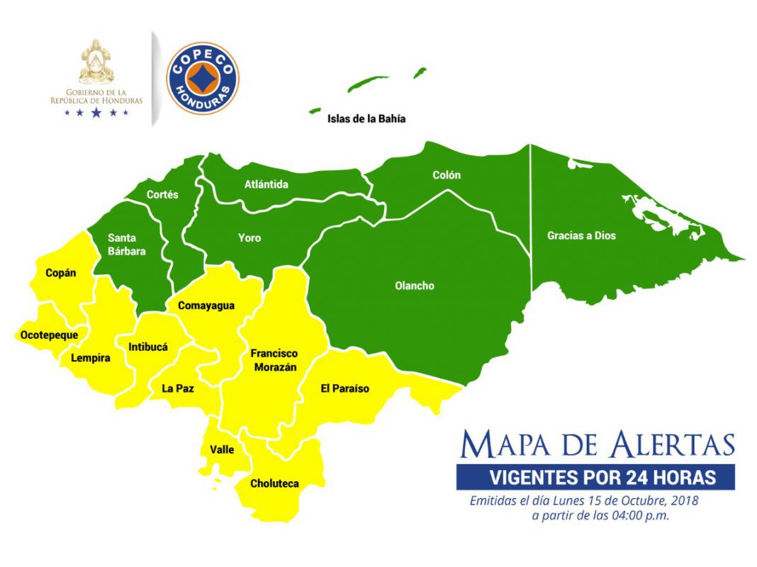 #Copeco mantiene vigente #AlertaAmarilla en: COPÁN, OCOTEPEQUE, LEMPIRA, INTIBUCÁ, LA PAZ, COMAYAGUA, FRANCISCO MORAZÁN, EL PARAÍSO VALLE y CHOLUTECA. Y #AlertaVerde en: GRACIAS A DIOS, OLANCHO, COLÓN, YORO, ATLÁNTIDA, ISLAS DE LA BAHÍA, CORTÉS y SANTA BÁRBARA