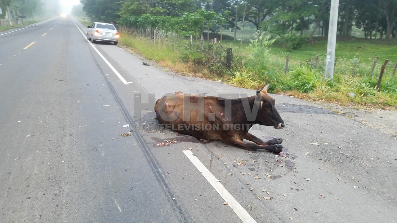A la orilla del pavimento quedó una vaca y con golpes en su cuerpo ya que fue embestida por un vehículo que transitaba por la carretera a Olancho a la altura de Limones.
