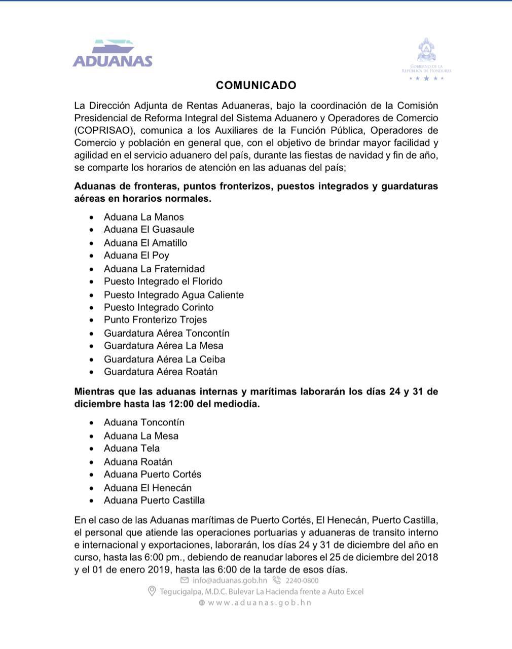 En el caso de las Aduanas marítimas de Puerto Cortés, El Henecán, Puerto Castilla, el personal que atiende las operaciones portuarias y aduaneras de transito interno e internacional y exportaciones, laborarán, los días 24 y 31 de diciembre del año en curso, hasta las 6:00 pm., debiendo de reanudar labores el 25 de diciembre del 2018 y el 01 de enero 2019, hasta las 6:00 de la tarde de esos días.