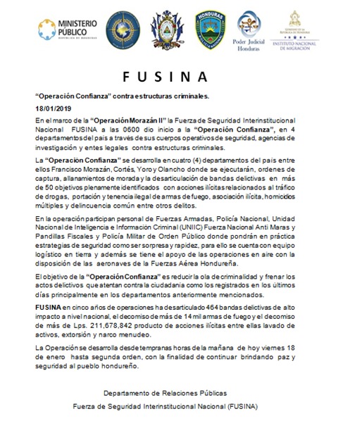 Más de 30 personas detenidas en los departamentos de Olancho, Yoro, Cortés y en Francisco Morazán son el resultado de la «Operación Confianza» que emprende FUSINA.