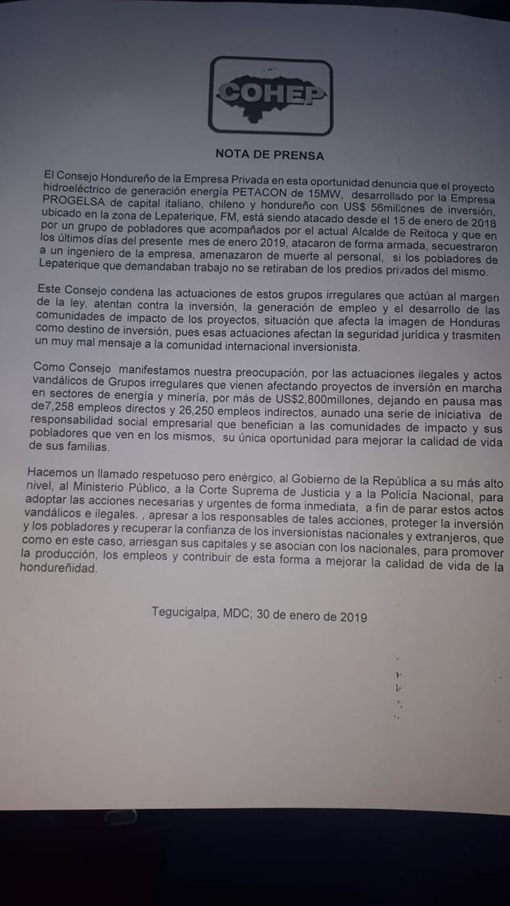 El hecho fue anunciado en conferencia de prensa en las instalaciones del COHEP, el proyecto se estaba llevando a cabo en el municipio de Lepaterique y aseguran que los trabajadores de este proyecto están siendo atacados por pobladores y el alcalde de Reitoca desde Enero de 2018.