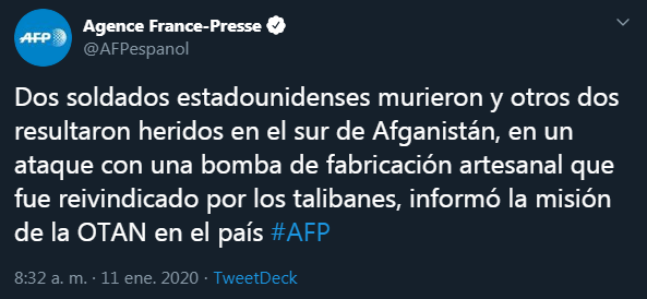 Ataque con bomba artesanal mata a dos soldados de EEUU en Afganistán