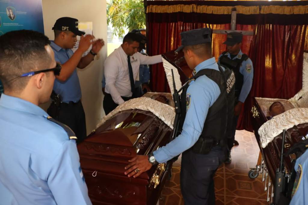 En las instalaciones de la Policia Nacional en El Progreso velan los restos de dos oficiales que perdieron la vida el jueves en los juzgados de aquella ciudad.