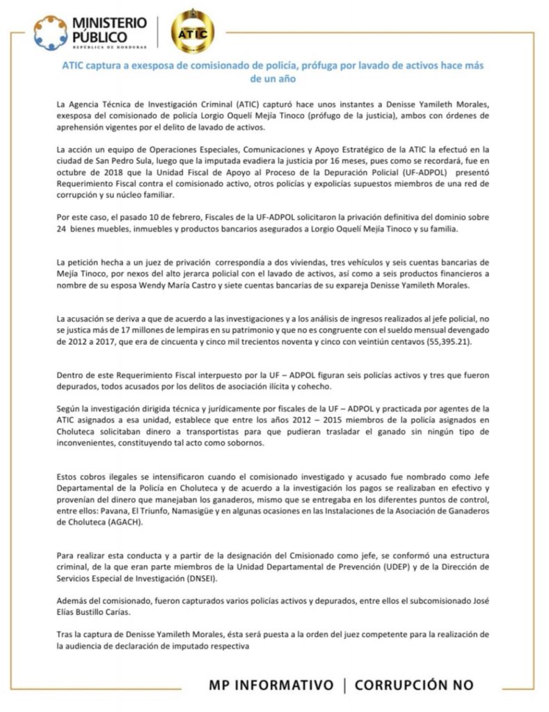 Tras la audiencia de imputado el tribunal que conoce la causa contra la señora Denisse Yamileth Morales dictaminó detención judicial contra la ex-esposa del comisionado de policía Lorgio Oquelí Mejia.