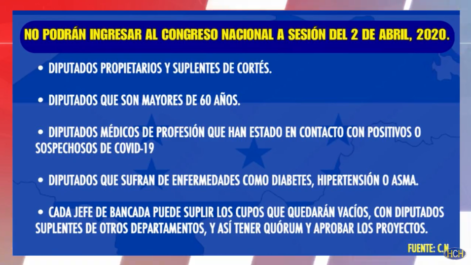 Una de esas medidas fue el que diputados que cumplieran con la tercera edad mandaran a su suplente, y que aquellos que sufrieran enfermedades relacionadas a la hipertensión tomaran la misma medida.