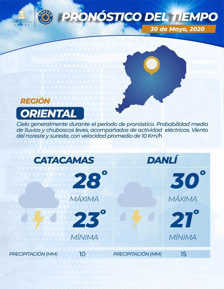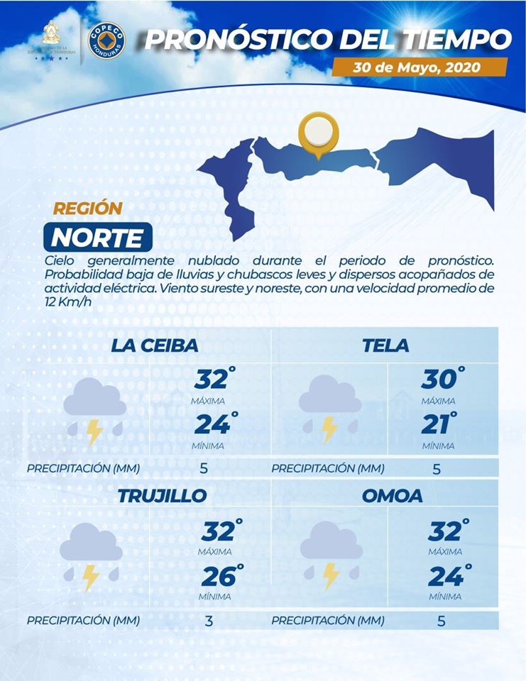 Pronóstico del tiempo para hoy sábado 30 de mayo¡Buenos días! Hoy Sábado y producto del ingreso de humedad proveniente del Oceano Pacífico, continuaremos con las condiciones de lluvias y chubascos de intesidad variada acompañadas de actividad eléctrica, principalmente en las regiones del Sur ,Occidente, Centro y Oriente de Honduras. Esperando que estas cantidades de precipitación se incrementen en el transcurso de los días, debido a un sistema de Baja Presión que estará afectando el país.Ver más detalles a continuación ??????