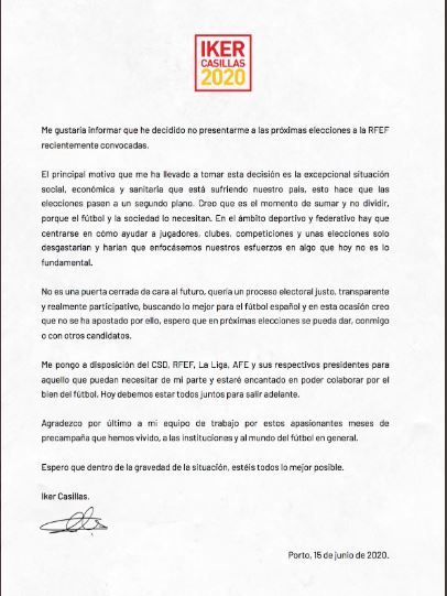 El todavía portero del Oporto considera que el adelanto en el proceso electoral, que ya está en marcha desde la pasada semana, no ayuda a que el proceso electoral sea lo justo y transparente que él considera debe ser, poniéndose a disposición de todos los estamentos del deporte y del fútbol español para colaborar en la mejora del mismo.