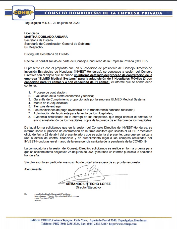COHEP solicita a Invest-H un informe detallado de la compra de hospitales móviles