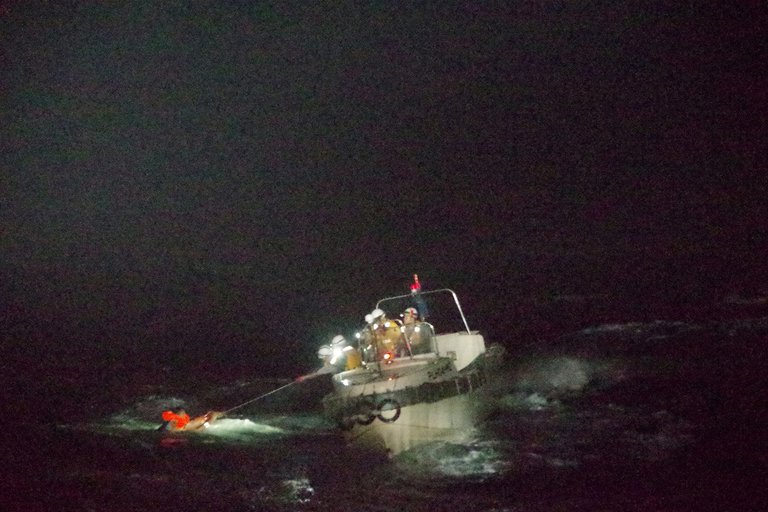 Tres buques de la guardia costera, cinco aviones y buceadores trabajan en la operación de rescate. La alarma la dio cuando el navío se encontraba a 185 kilómetros al oeste de Amami Oshima, y fue rescatado por la guardia costera a 120 kilómetros al noroeste de esa isla, y en todo momento pudo mantenerse a flote gracias al salvavidas.