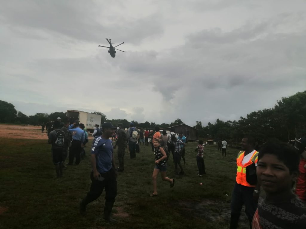 3-Hasta este momento el helicóptero del Comando Sur, ha realizado alrededor de 10 viajes, donde vienen sacos especiales llenos de víveres, entre ellos alimento y ropa para niños y adultos.