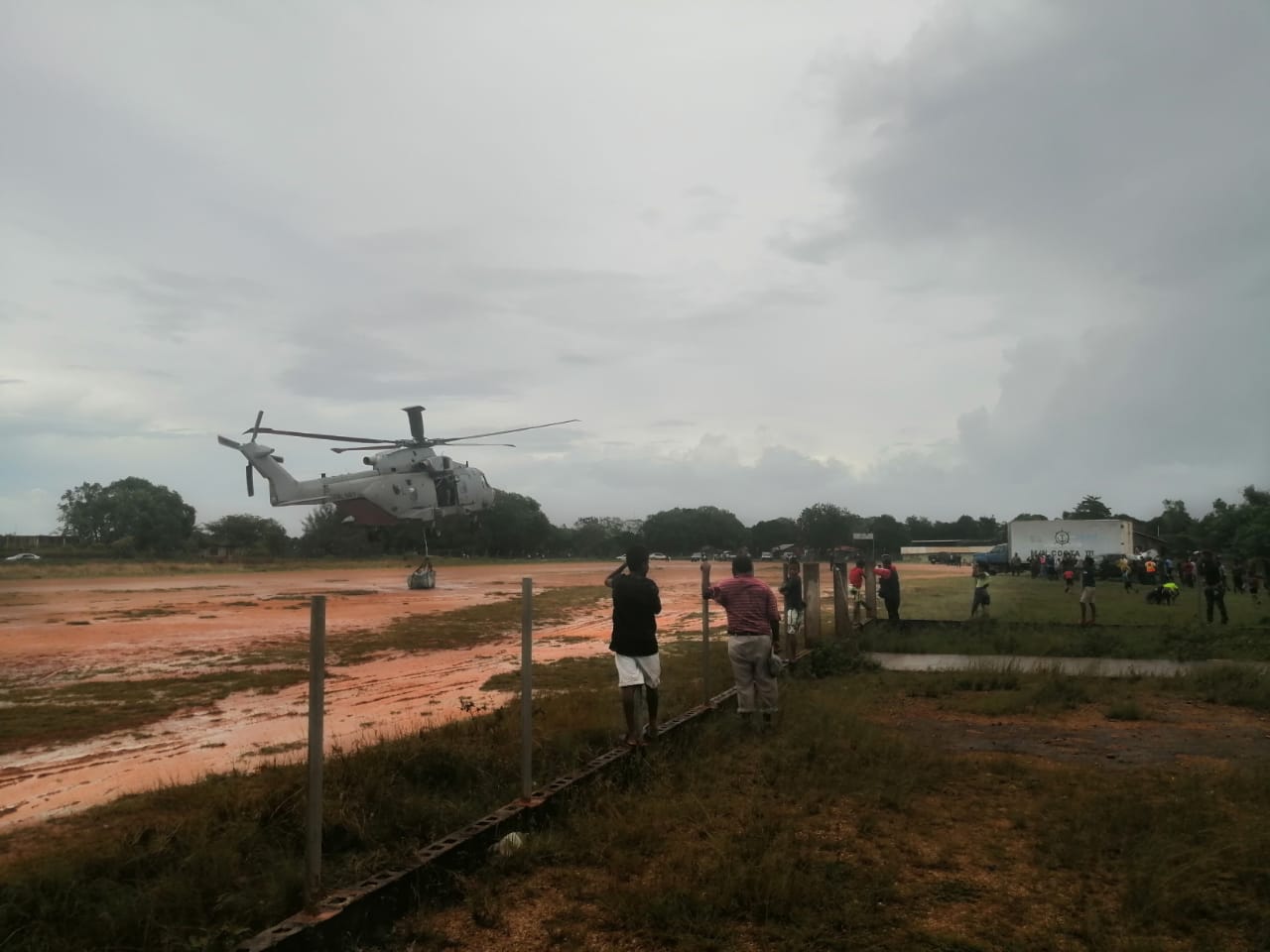 3-Hasta este momento el helicóptero del Comando Sur, ha realizado alrededor de 10 viajes, donde vienen sacos especiales llenos de víveres, entre ellos alimento y ropa para niños y adultos.