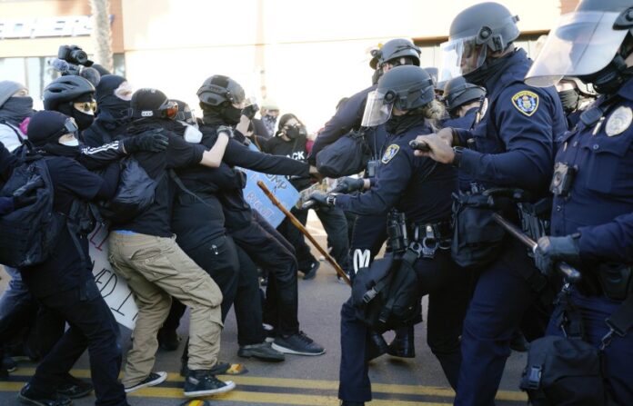 Según el Departamento de Policía de San Diego, los manifestantes arrojaron piedras, botellas, huevos y otros objetos a los agentes y los rociaron con pimienta.
