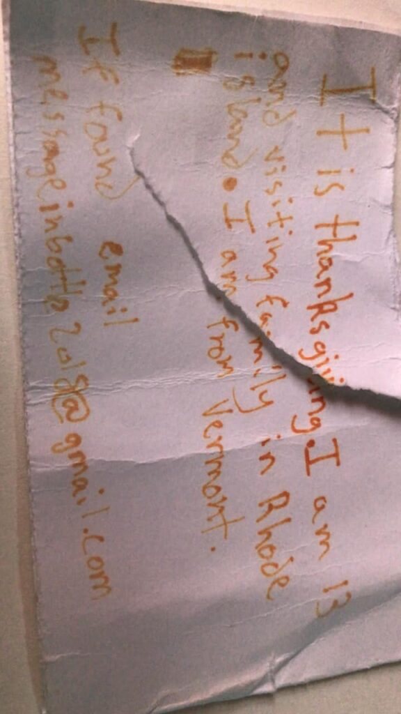 «Es Acción de Gracias. Tengo 13 años y estoy visitando a mi familia en Rhode Island. Yo soy de Vermont. Si se encuentra [la nota], envíe un mensaje de correo electrónico a [email protected]», reza el mensaje.