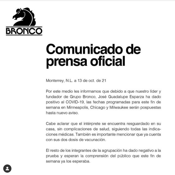 El cantante y líder del grupo Bronco, José Guadalupe Esparza, conocido popularmente como Lupe Esparza, dio positivo a Covid-19. Así lo informó la agrupación en un comunicado en el que señaló que por esta razón se pospondrán los conciertos programados para el fin de semana en Minneapolis, Chicago y Milwakee, en Estados Unidos.