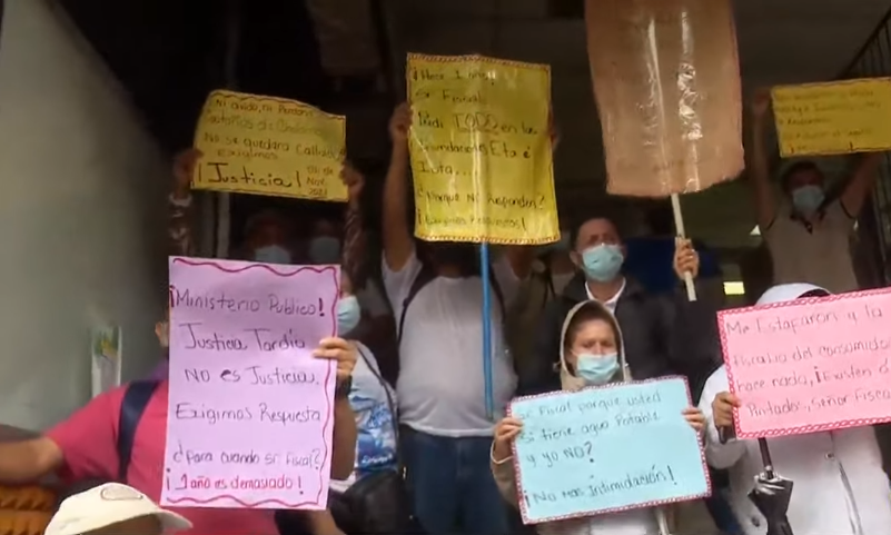 Frente a las instalaciones del Ministerio Publico, los vecinos de la Residencial Los Castaños en Choloma hacen la repetitiva denuncia a una inmobiliaria que supuestamente los han estafado.