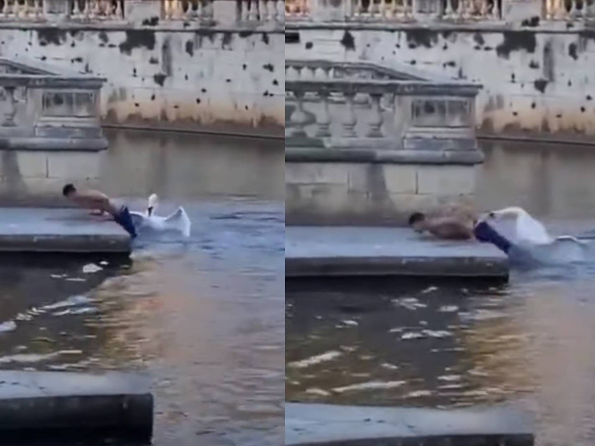 El valiente joven logra su cometido y entra con un clavado al agua a varios metros de distancia del cisne. Sin embargo, no contaba con que el ave no tardaría en detectarlo y dirigirse rápidamente hacia él para atacar.