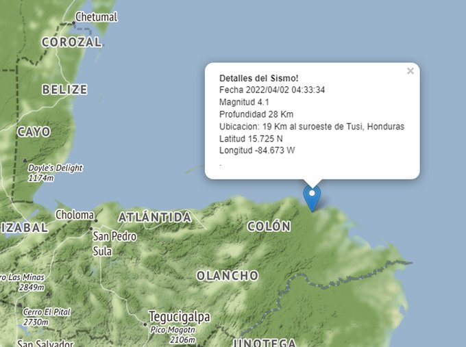 El sismo se registró a 19 kilómetros al noroeste de Tussi, entre Palacios y Brus Laguna con una profundidad de 28 kilómetros.