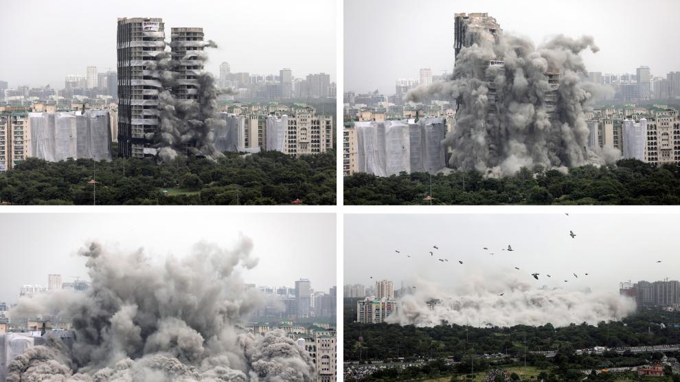 Más de 3.700 kilos de explosivos se emplearon para demoler en tan solo nueve segundos este domingo dos enormes rascacielos de una treintena de plantas en las proximidades de Nueva Delhi, cuya implosión generó una gran expectación en la India por estar situadas apenas a unos metros de distancia de varios edificios residenciales.