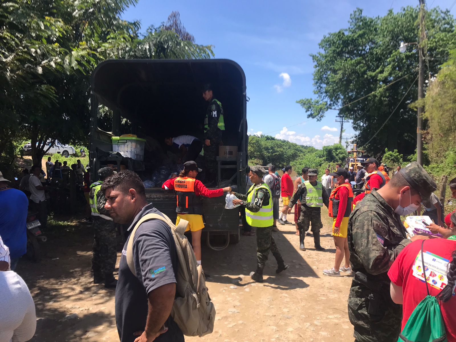 El Cuerpo de Bomberos realiza trabajos de rescate y de ayuda a los pobladores que se encuentran al otro lado del río Chamelecón.