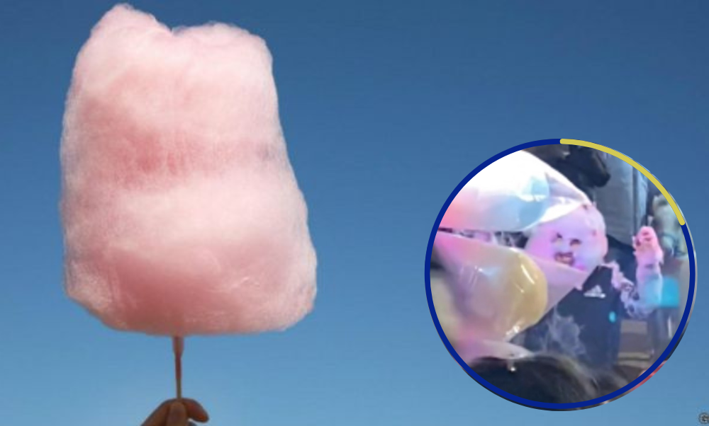 Luego se puede ver un nuevo momento del niño en donde pasea en la feria con el rostro cubierto con el algodón ya como si fuera una máscara, además de tener una especie de bastón realizado con el dulce.