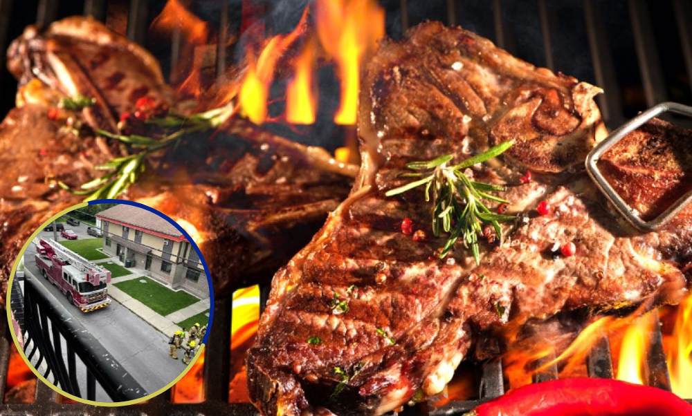 En el clip, en una de las imágenes se ve a un grupo de bomberos afuera de la casa de la persona que está preparando la carne asada y en otra de las fotos al camión de bomberos y a más hombres que realizan esta labor.