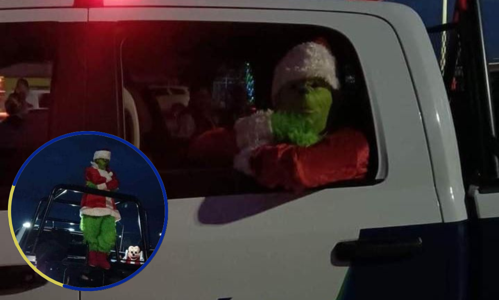 En las fotografías se observa al personaje de El Grinch con el tradicional traje rojo de Santa Claus abordo de la parte trasera de una camioneta tipo pick up de la Policía Estatal y con evidente molestia en su rostro y brazos cruzados.