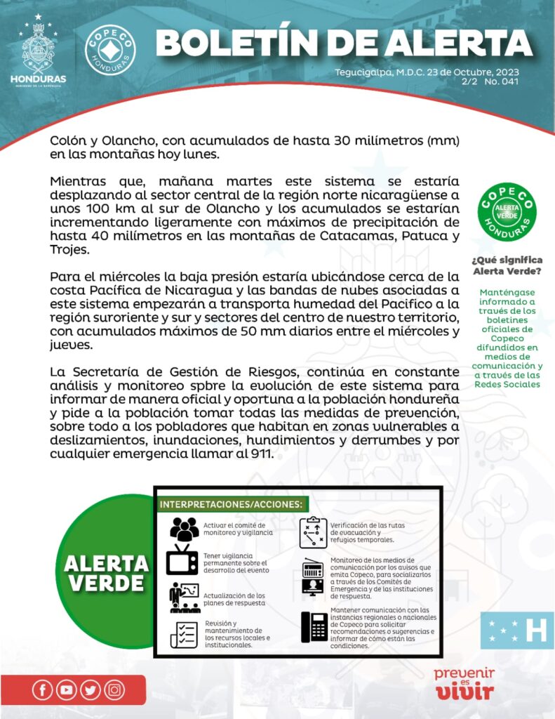 Asimismo, la circulación ciclónica abarcará Los departamentos del oriente de Honduras, transportando humedad del mar Caribe y produciría lluvias y chubascos de débiles a moderados y dispersos en el departamento de Gracias a Dios.