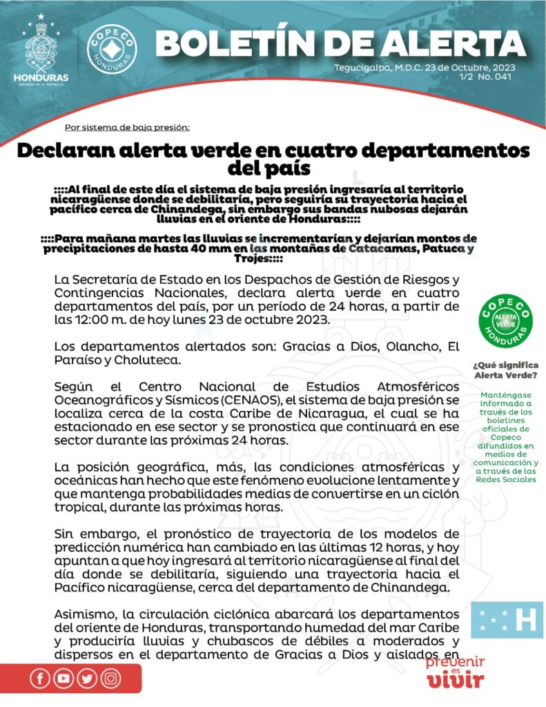 La Secretaría de Estado en los Despachos de Gestión de Riesgos y Contingencias Nacionales, declara alerta verde en cuatro departamentos del país, por un período de 24 horas, a partir de las 12:00 m. de hoy lunes 23 de octubre 2023.