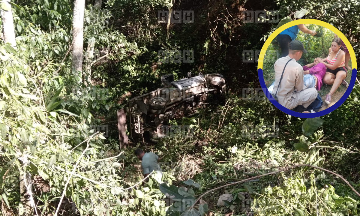 Cinco personas que se conducían en un vehículo tipo pick up se salieron heridas luego que la unidad de transporte en la que se movilizaban volcó y terminara en el fondo de una hondonada en una zona cafetalera de El Paraíso.
