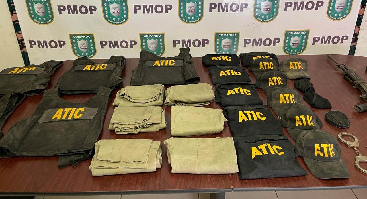 La caleta también contenía objetos incautados incluyendo un fusil Beretta, aros de presión, chalecos balísticos, camisas, pantalones, pasamontañas, gorras y cortadoras de metal.