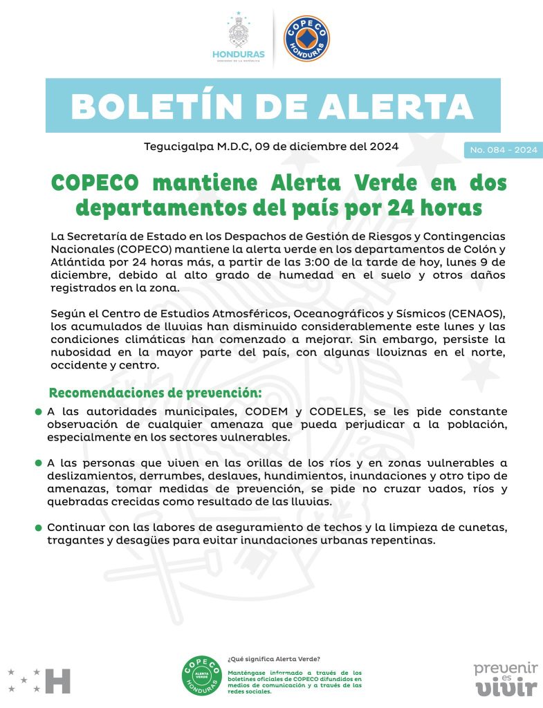 La Comisión Permanente de Contingencias (Copeco), ha informado este lunes que se mantiene la alerta verde por 24 horas más en dos departamentos del país ante al alto grado de humedad en los suelos y daños que se registran productos de lluvias en el país.