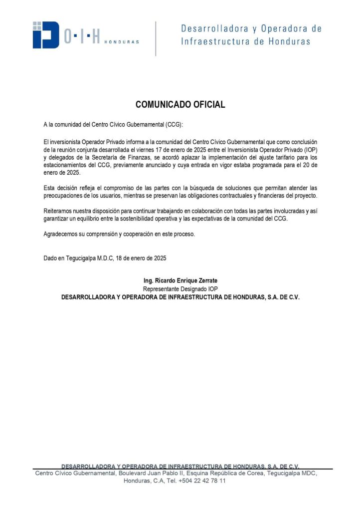 A través de un comunicado, la empresa Desarrolladora y Operadora de Infraestructura de Honduras, ha informado este sábado que luego de una reunión conjunta desarrollada entre el Inversionista Operador Privado (IOP) y delegados de la secretaría de Finanzas, han acordado el aplazamiento del cobro en el estacionamiento del Centro Cívico Gubernamental (CCG).
