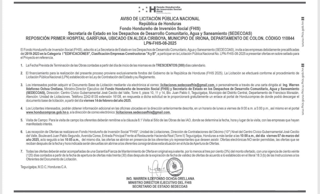 Las autoridades del Fondo Hondureño de Inversión Social (FHIS) anuncian la licitación para la mejora y construcción del primer hospital garifuna en Ciriboya, Iriona, departamento de Colón.