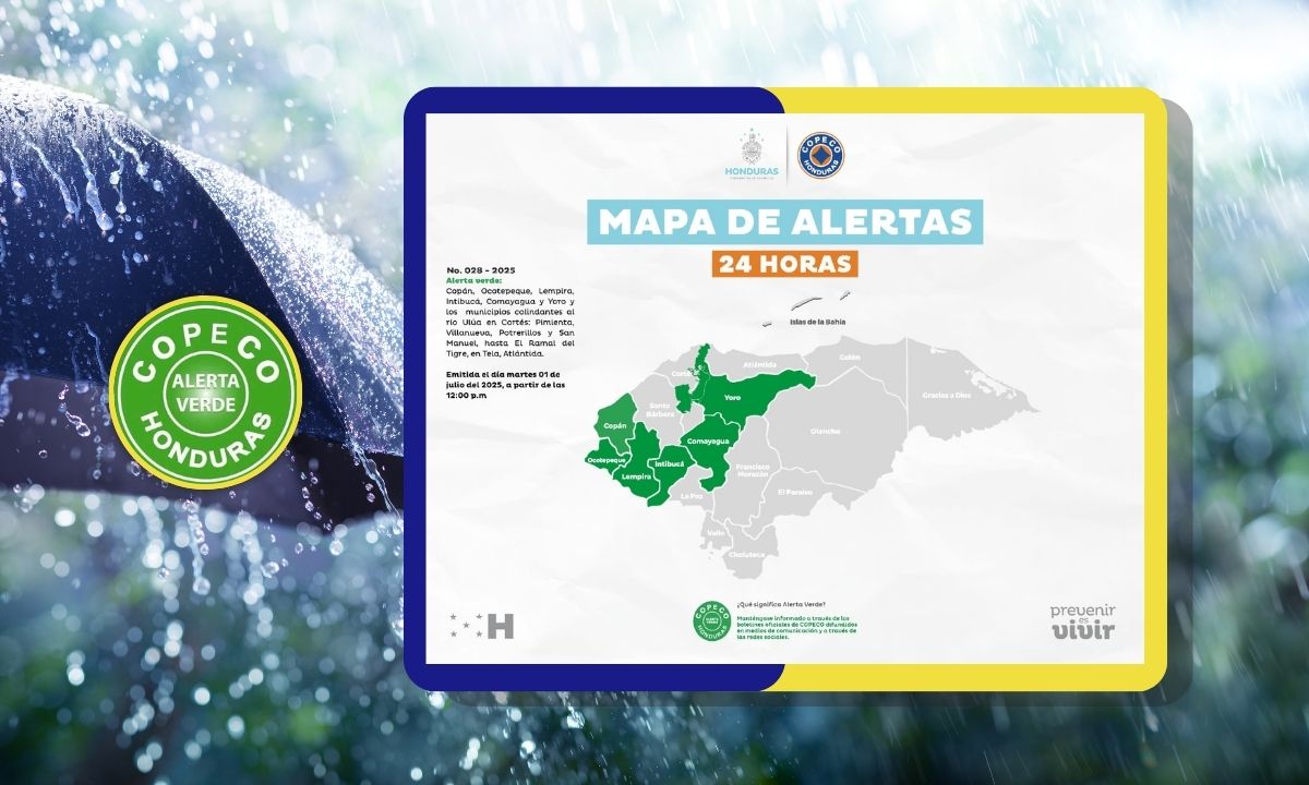 Por ingreso de onda tropical y vaguada, la Secretaría de Estado en los Despachos de Gestión de Riesgos y Contingencias Nacionales (Copeco) ha extendido la alerta verde en Copán y Ocotepeque, y también agrega a la lista los departamentos de Yoro, Lempira, Intibucá y Comayagua en Honduras.
