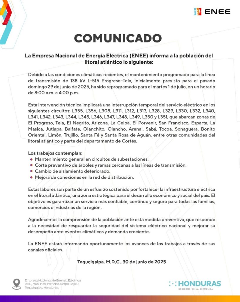 La Empresa Nacional de Energía Eléctrica (ENEE) informó este martes que el mantenimiento programado para la línea de transmisión L-515 entre Progreso y Tela, originalmente previsto para el 29 de junio, fue reprogramado para este martes 1 de julio.