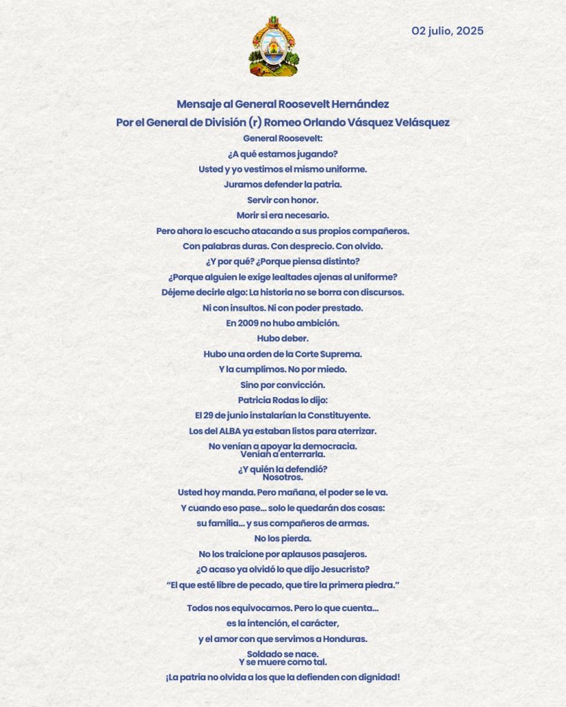 El ex jefe del Estado Mayor Conjunto, Romeo Vásquez Velásquez, reaccionó al discurso del actual jefe de las Fuerzas Armadas, Roosevelt Hernández, mediante un mensaje público cargado de reproche y reflexión.