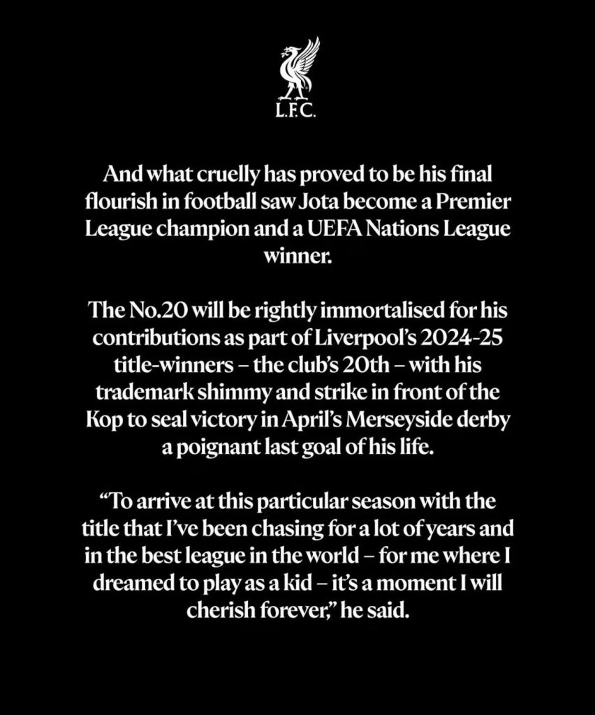 A través de sus redes oficiales, Liverpool decidió rendirle un homenaje a Diogo Jota horas después de que se hiciera oficial la muerte del jugador a causa de un accidente automovilístico junto a su hermano André Silva.