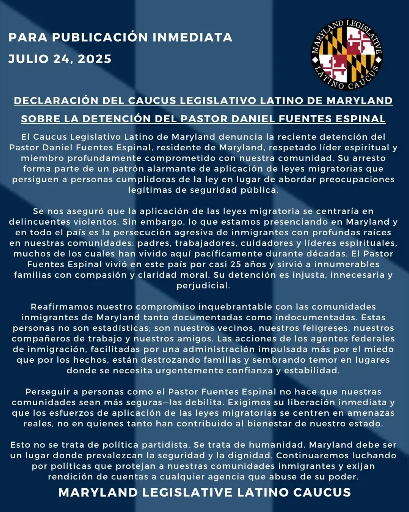 Además, el Caucus Legislativo Latino de Maryland solicitó la liberación del pastor.