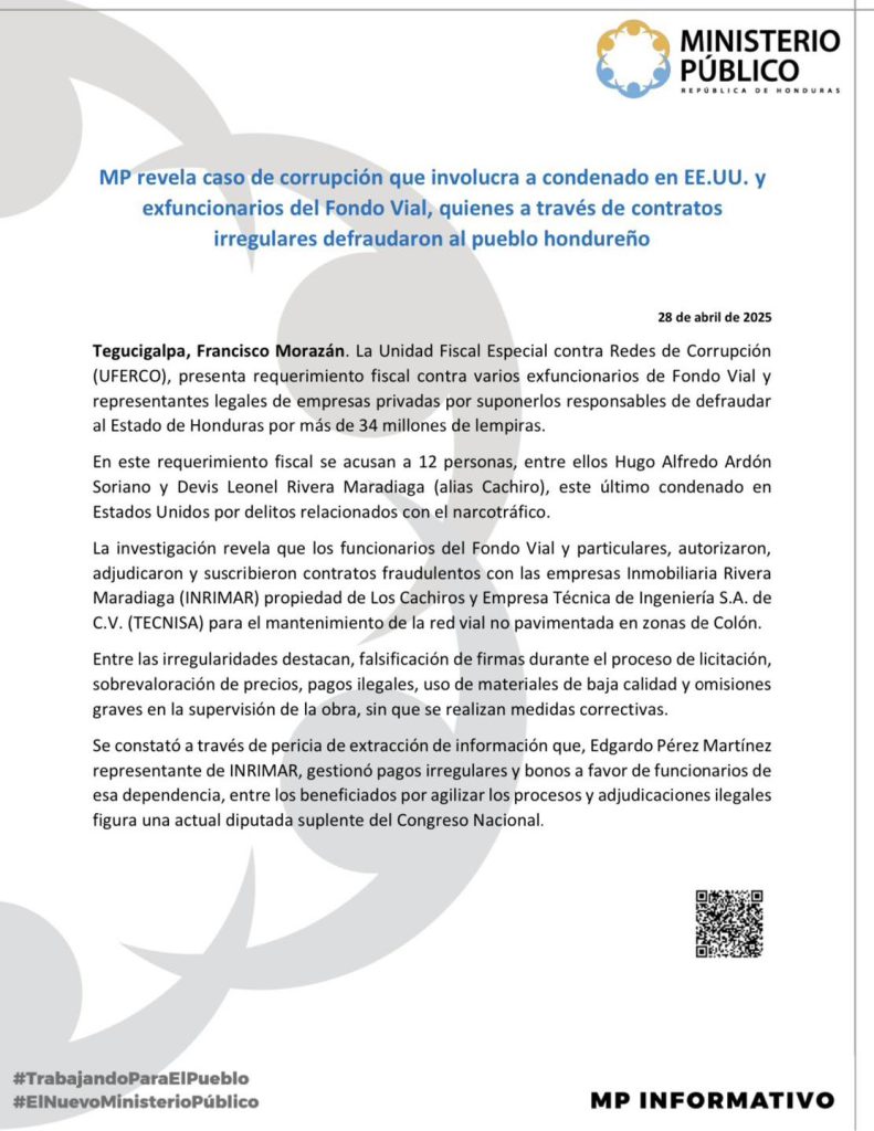 Además, se menciona que una diputada suplente habría recibido sobornos para facilitar la adjudicación de los contratos, y que Edgardo Pérez Martínez canalizó pagos ilegales a funcionarios del Fondo Vial.