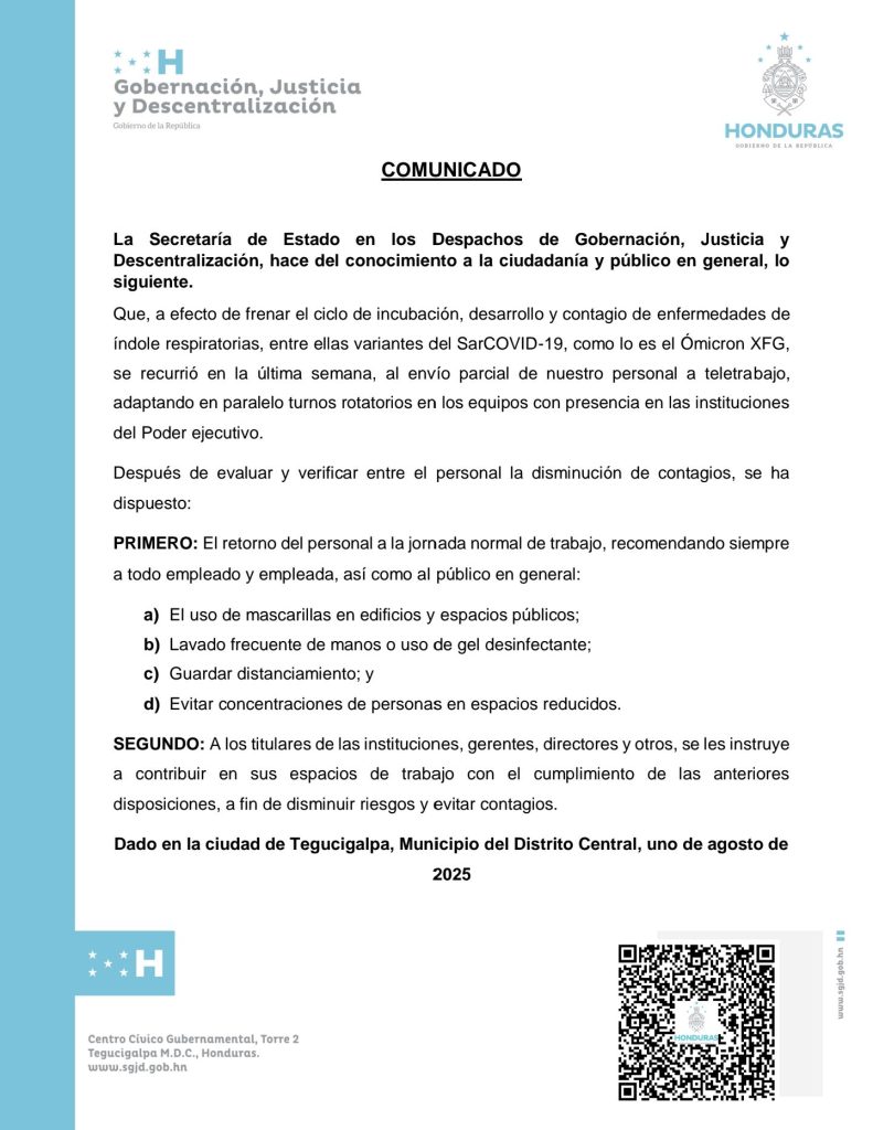 Tras una semana de implementación parcial del teletrabajo para reducir contagios respiratorios, la Secretaría de Gobernación, Justicia y Descentralización anunció el retorno del personal a la jornada laboral habitual.