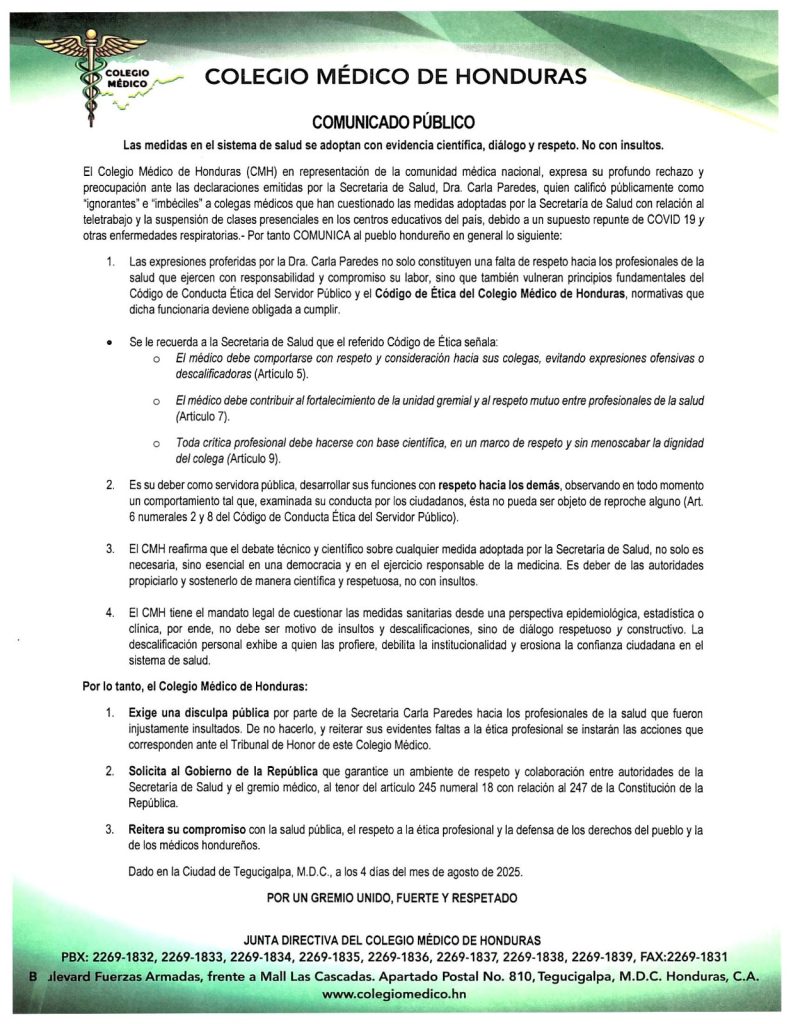 El Colegio Médico de Honduras (CMH) expresó su rechazo ante declaraciones de la ministra de salud, Carla Paredes, quien habría calificado de “ignorantes” e “imbéciles” a médicos que cuestionaron las recientes medidas tomadas por la Secretaría de Salud sobre el teletrabajo y la suspensión de clases presenciales debido a enfermedades respiratorias.