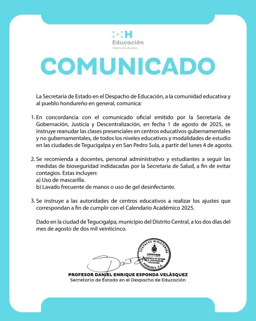 La Secretaría de Educación anunció el retorno a clases presenciales en Tegucigalpa y San Pedro Sula a partir de hoy lunes 4 de agosto, tras la suspensión temporal derivada de un presunto brote de COVID-19.