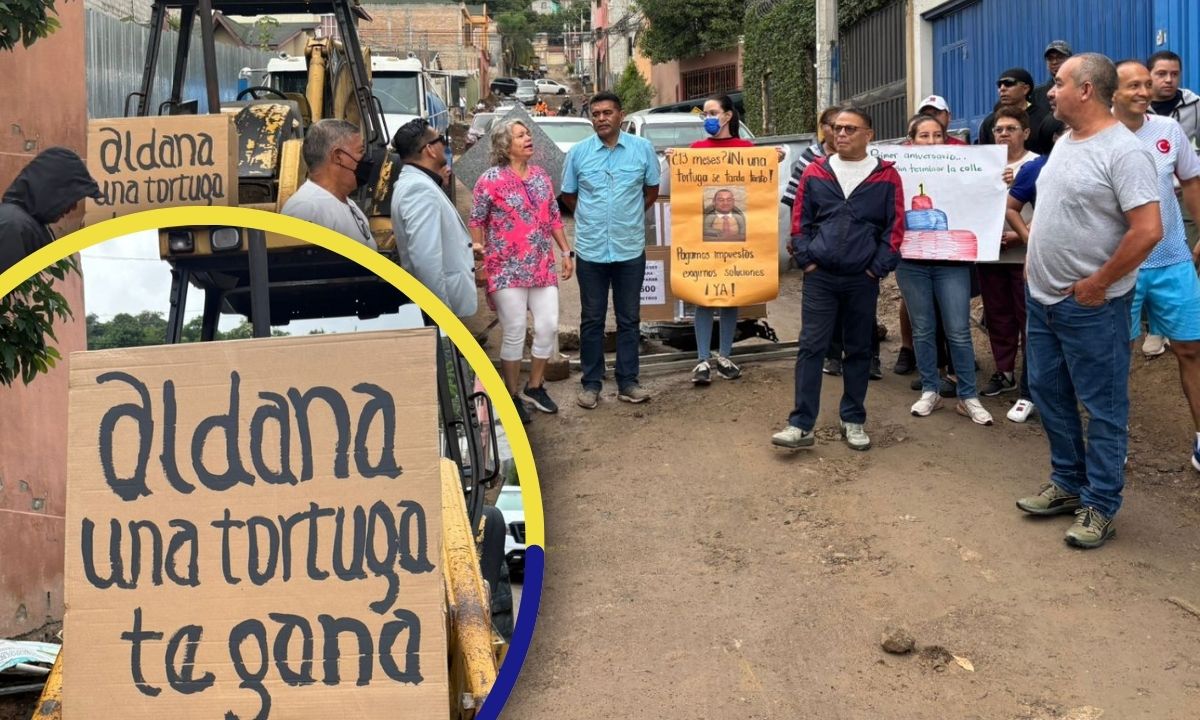Con pancarta, vecinos de la residencial El Dorado de la capital protestaron este martes para exigirle al alcalde del Distrito Central, Jorge Aldana, que agilice la construcción de la calle principal de acceso a la zona, la cual lleva meses en estado deplorable.