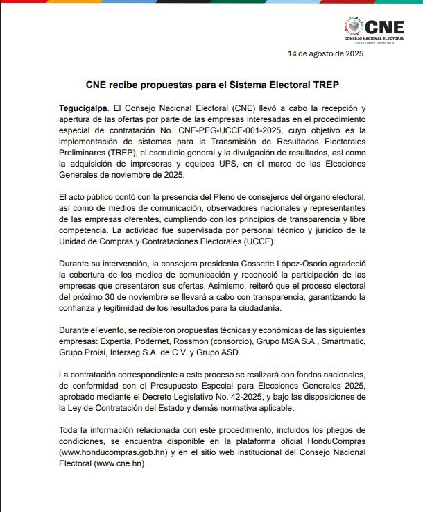 Siguiendo con el plazo dado por el Congreso Nacional, este jueves han arribado ante el Consejo Nacional Electoral (CNE) diversas empresas para presentar sus ofertas para adjudicarse el sistema de Transmisión de Resultados Preliminares (Trep).