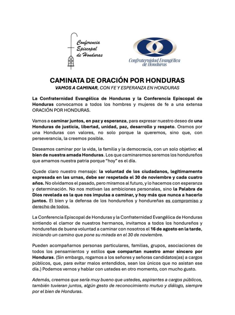 Este sábado las Iglesias Evangélica y Católica llevan a cabo una caminata de oración en todo el país y en ciudades de Estados Unidos, con el objetivo de clamar por paz, justicia y democracia en Honduras.