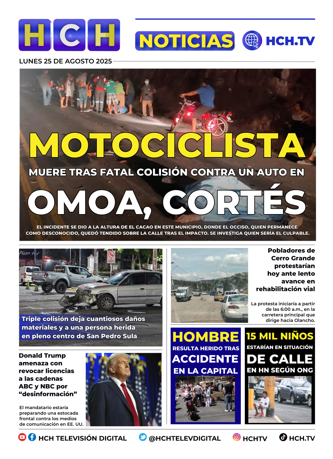 © 2025 - HCH Televisión Digital - Noticias de Honduras y el Mundo. Anillo Periférico, Complejo Empresarial Tegucigalpa, Honduras, C.A. Tel: (504) 2235-3245 / 2235-3246 / 2235-4875 / 2235-4876 LLÁMENOS GRATIS DESDE EE.UU: 3052801682 y 3052801735 © Copyright 2025 - HCH Televisión Digital. Todos nuestros contenidos están protegidos con derechos de autor.