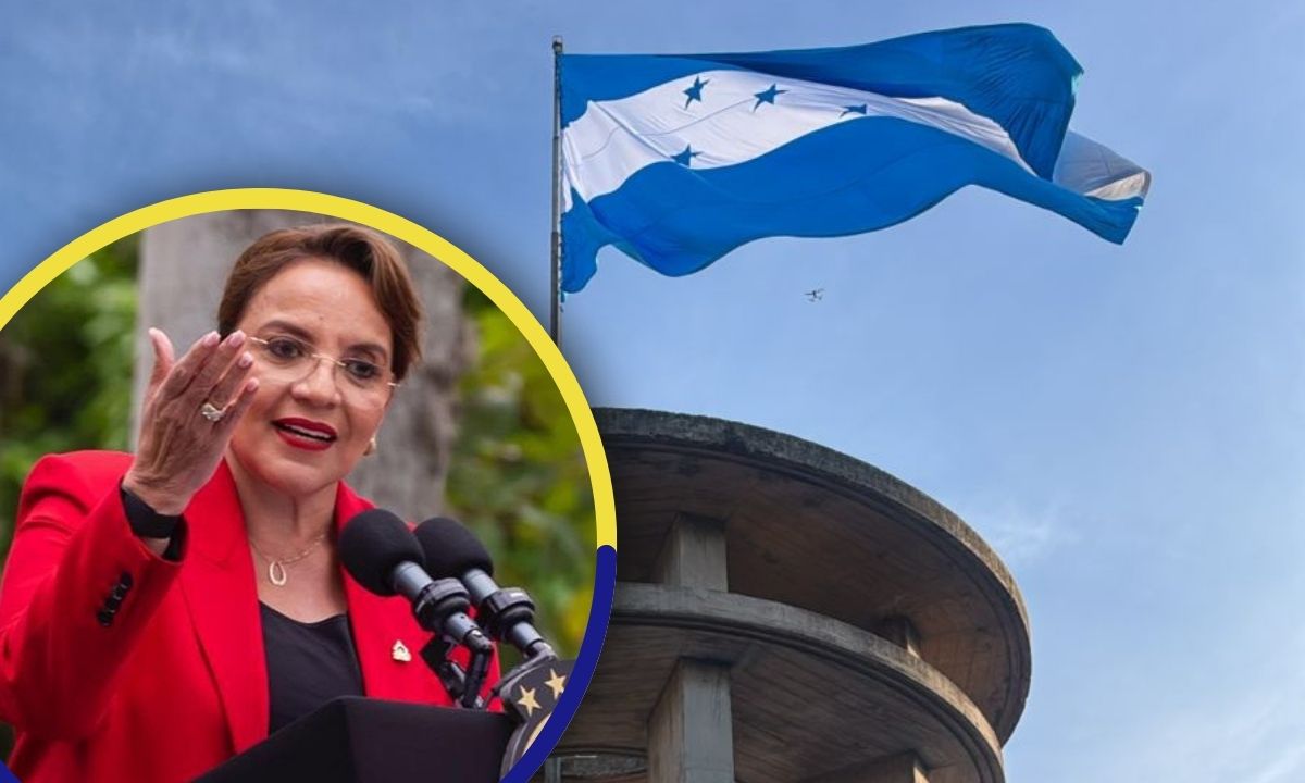 La presidenta Xiomara Castro encabezó este lunes el acto de izada de la Bandera Nacional en el cerro Juana Laínez, en Tegucigalpa.