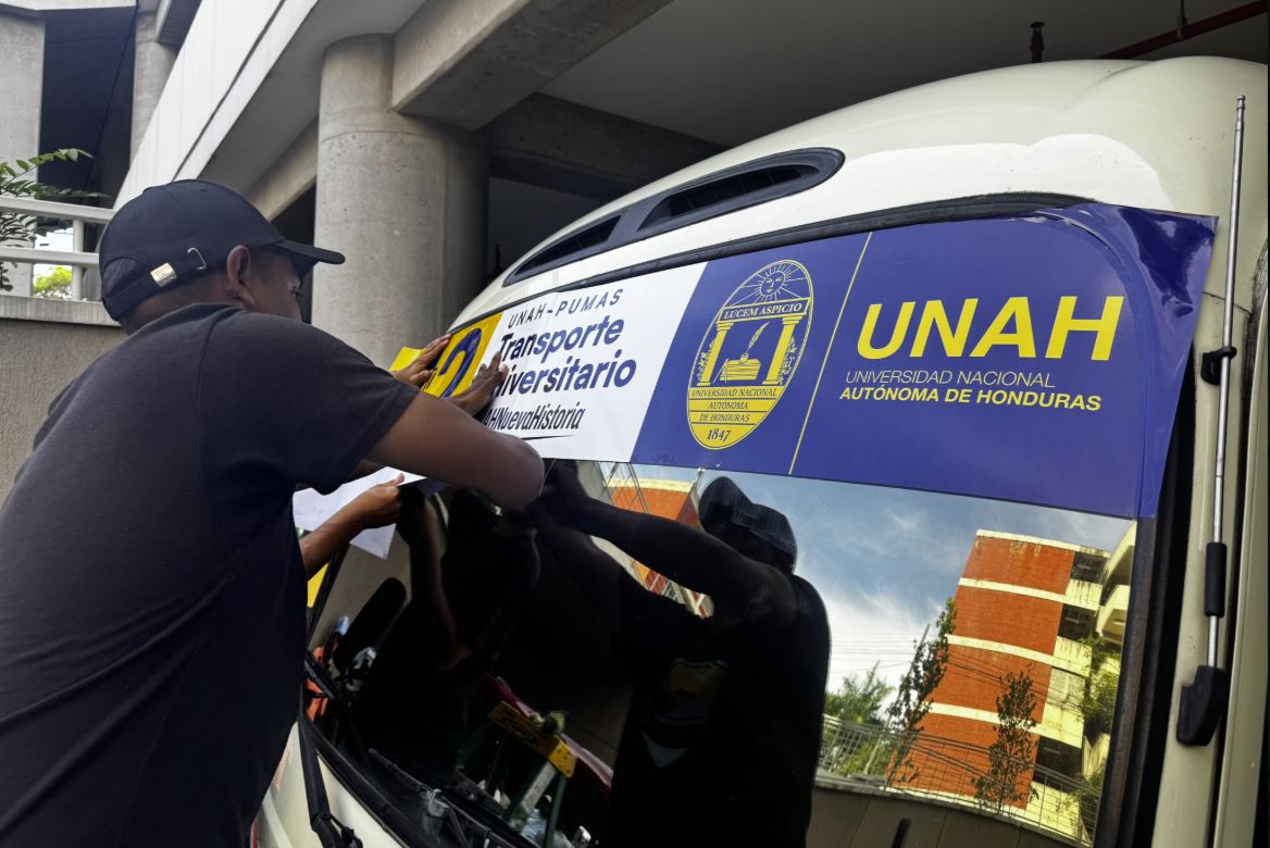 Este sábado se realizó el proceso de rotulación de las unidades, como parte del proyecto piloto de Transporte Universitario UNAH-PUMAS, para que cada estudiante pueda reconocerlas fácilmente en las estaciones habilitadas.