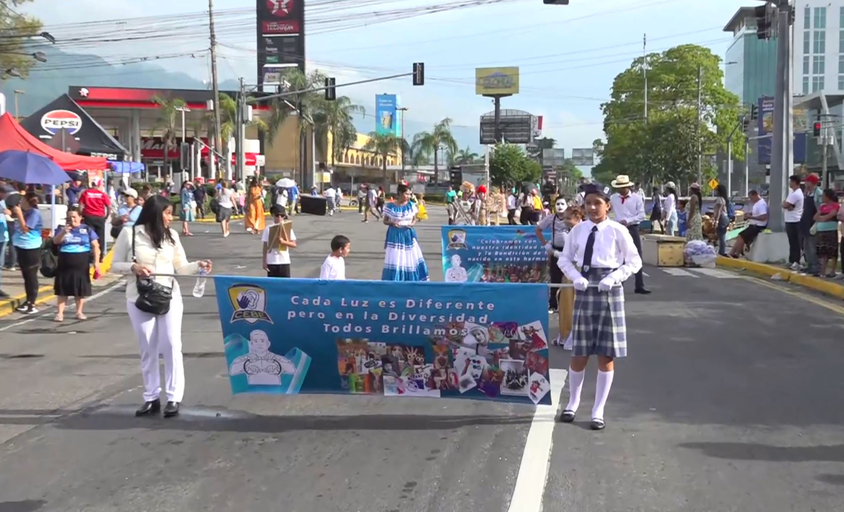 Las calles sampedranas se llenaron de público que aplaudió el paso de las bandas marciales, cuadros de danza folclórica y estudiantes que desfilaron con pancartas alusivas a la libertad y los símbolos nacionales.