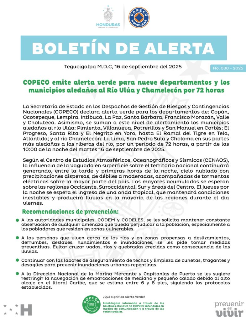 La Comisión Permanente de Contingencias (COPECO), emitió alerta verde para nueve departamentos y municipios aledaños al río Ulúa y Chamelecón por 72 horas, debido a las lluvias que se registrarán en Honduras.